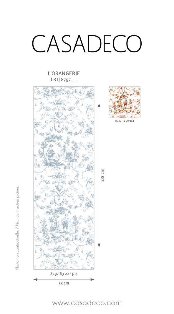 Une impression numérique aux couleurs vibrantes. Devant nous se dresse un agrume tout droit sorti de l’Orangerie du Roi. Sous son ombre, un petit marquis s’essaie à planter une fleur exotique. Plus loin, une châtelaine ramasse des œufs en toute décontraction. Les éléments décoratifs (embrasses, urnes) fraient avec les fleurettes, brouettes et arrosoirs en un charmant désordre.